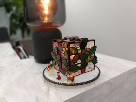 写真は、クリスマスモードということで、メンバーのMさんが手作りしたステンドグラスのクリスマスツリーです。ご厚意でジムに飾らせていただいており、大変和やかな雰囲気を演出してくれています。